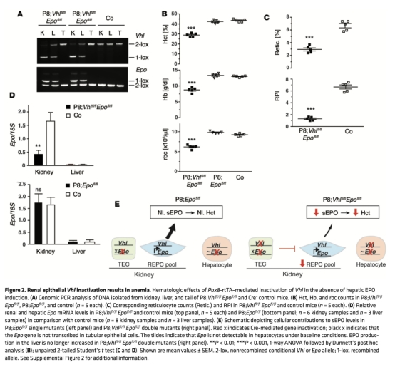 2 測量了EPO mRNA水平和血清EPO濃度。數(shù)據(jù)來自圖1、圖2、圖3和圖6。研究意義是顯示腎臟EPO產(chǎn)生被抑制,而肝臟EPO可能補(bǔ)償,但雙敲除小鼠仍貧血,突顯腎臟特異性調(diào)節(jié)。