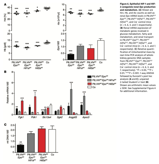 7 測量了EPO產(chǎn)生細(xì)胞(REPCs)數(shù)量,通過原位雜交。數(shù)據(jù)來自圖3。研究意義是顯示REPCs減少,表明上皮HIF激活間接影響間質(zhì)細(xì)胞可塑性。