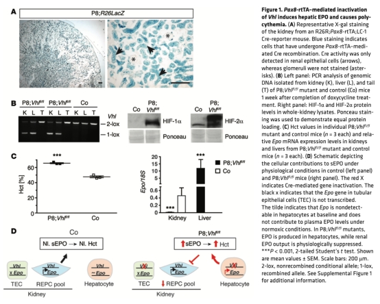 論文摘要指出腎臟在成人紅細(xì)胞生成中起核心作用,是促紅細(xì)胞生成素(EPO)的主要來源。EPO是一種氧敏感性糖蛋白,對紅細(xì)胞生產(chǎn)至關(guān)重要。研究使用小鼠遺傳方法,調(diào)查腎臟上皮缺氧誘導(dǎo)因子(HIF)在紅細(xì)胞生成中的作用。發(fā)現(xiàn)通過誘導(dǎo)近端腎單位von Hippel-Lindau腫瘤抑制因子失活激活HIF,導(dǎo)致快速發(fā)展的低增殖性貧血,這與EPO產(chǎn)生腎間質(zhì)細(xì)胞減少相關(guān)。EPO產(chǎn)生抑制與葡萄糖攝取增加、糖酵解增強(qiáng)、線粒體質(zhì)量減少、O2消耗減少和腎組織pO2升高相關(guān)。遺傳分析表明,腎小管間質(zhì)細(xì)胞串?dāng)_在腎臟上皮HIF激活條件下調(diào)節(jié)EPO產(chǎn)生。