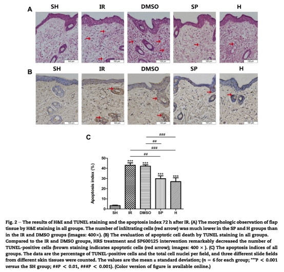 論文摘要指出,皮膚皮瓣轉(zhuǎn)移是整形外科中用于傷口修復(fù)和重建的基本方法,但缺血再灌注損傷導(dǎo)致的皮瓣丟失仍是一個嚴重問題。細胞凋亡是缺血再灌注損傷的主要原因。c-Jun N末端激酶是絲裂原活化蛋白激酶家族的成員,在細胞凋亡中起關(guān)鍵作用。本研究旨在驗證JNK激活在大鼠腹部皮膚缺血再灌注模型中對皮瓣凋亡的作用,并比較JNK抑制劑SP600125和富氫鹽水在皮膚缺血再灌注損傷中的保護效果。結(jié)果發(fā)現(xiàn),SP600125和富氫鹽水處理均能增加皮瓣存活面積、改善血流灌注、降低caspase-3活性,并調(diào)節(jié)凋亡相關(guān)蛋白表達,表明JNK信號通路介導(dǎo)了皮瓣凋亡,抑制JNK可能是一種治療策略。
