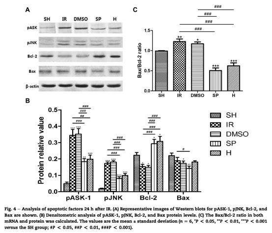 5 測量了凋亡相關(guān)蛋白表達,包括pASK-1、pJNK、Bcl-2和Bax,通過免疫組化(圖3)和Western blot(圖4)。研究意義是顯示處理組pASK-1和pJNK表達降低、Bcl-2表達升高,Bax/Bcl-2比率下降,說明JNK抑制通過調(diào)節(jié)促凋亡和抗凋亡蛋白平衡發(fā)揮保護效應(yīng)。