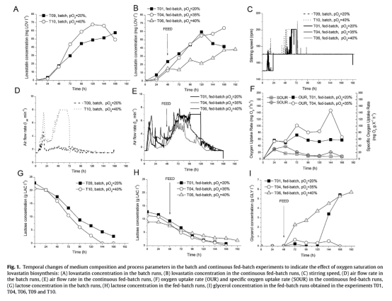 1 氧氣飽和度相關(guān)數(shù)據(jù):來自圖1,包括洛伐他汀濃度、攪拌速度、空氣流速、氧氣攝取率(OUR)和底物濃度隨時(shí)間的變化。研究意義:這些數(shù)據(jù)顯示氧氣飽和度對(duì)洛伐他汀生產(chǎn)有顯著影響,例如pO2=35%時(shí)滴度較高,但過高pO2(如40%)可能導(dǎo)致形態(tài)破壞和產(chǎn)量下降。結(jié)果幫助優(yōu)化生物反應(yīng)器的aeration策略,表明氧氣供應(yīng)需與碳源利用平衡以避免生產(chǎn)抑制。