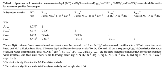 4 底棲擴散通量和N2O排放通量數據:來自圖5和表1。通過Fick定律計算NH4+、NO3-、NO2-和N2O的界面通量。研究意義是量化水深對氮遷移和排放的調控強度,發現根際NO2-通量和N2O排放對水深敏感(>1m時顯著增加),表明深水加劇厭氧過程促進反硝化中間產物積累。