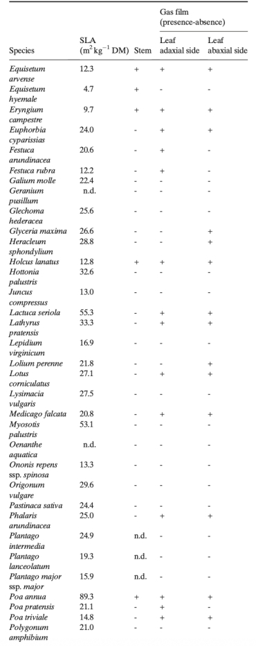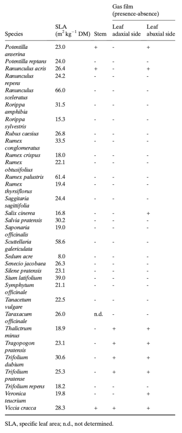 1 葉片氣體膜存在與否數據:來自Table 1。測量了95個物種的葉片氣體膜存在情況(莖、葉正面和背面)。研究意義是直接評估氣體膜作為淹沒耐受性狀的普遍性,顯示氣體膜在物種中的分布模式,有助于理解其生態作用。數據顯示氣體膜在很少洪水的區域更常見,可能與禾本科植物優勢相關。