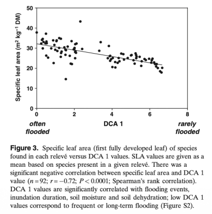 2 比葉面積(SLA)數據:來自Table 1和Fig. 3。測量了物種的SLA值,并發現SLA與洪水發生呈正相關(r=-0.72)。研究意義是表明薄葉或高孔隙度葉片能減少氣體擴散阻力,增強淹沒條件下的氣體交換,這可能是植物適應頻繁洪水的關鍵性狀。
