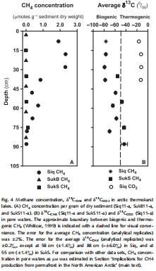 數(shù)據(jù)來源:圖4A展示了甲烷濃度深度剖面;圖4B展示了δ13C-CH?值。