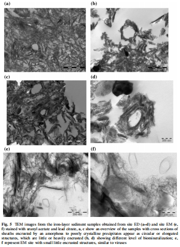 研究意義:提供了鐵層中存在類似鐵氧化細菌(如赭色纖毛菌 Leptothrix ochracea)鞘結構的形態學證據,表明微生物形態與鐵礦物沉淀密切相關。