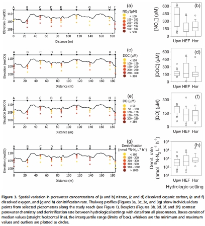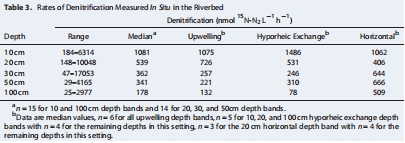 反硝化是硝酸鹽去除的主要途徑,在有機碳貧乏的滲透性沉積物中可發生至1米深,速率與農業河流相當。