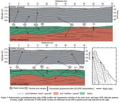數據內容:識別出四種主要雷達相(R1:水面;R2:沙/礫石,近水平層理;R3a/b:卵石/礫石, oblique-parallel反射器;R4:新老沉積物界限)。據此構建三維模型,界定粗、細顆粒沉積結構的空間分布。