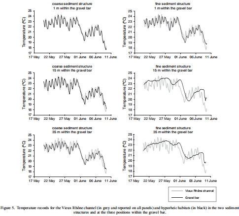 數據內容:粗顆粒結構中各點的間隙水日溫度波動與地表水顯著相關(r > 0.75),且旅行時間短(1.33-5.33小時)。細顆粒結構中僅1m處有弱相關,15m和35m處無顯著相關,旅行時間長(16.67和15.00小時)。
