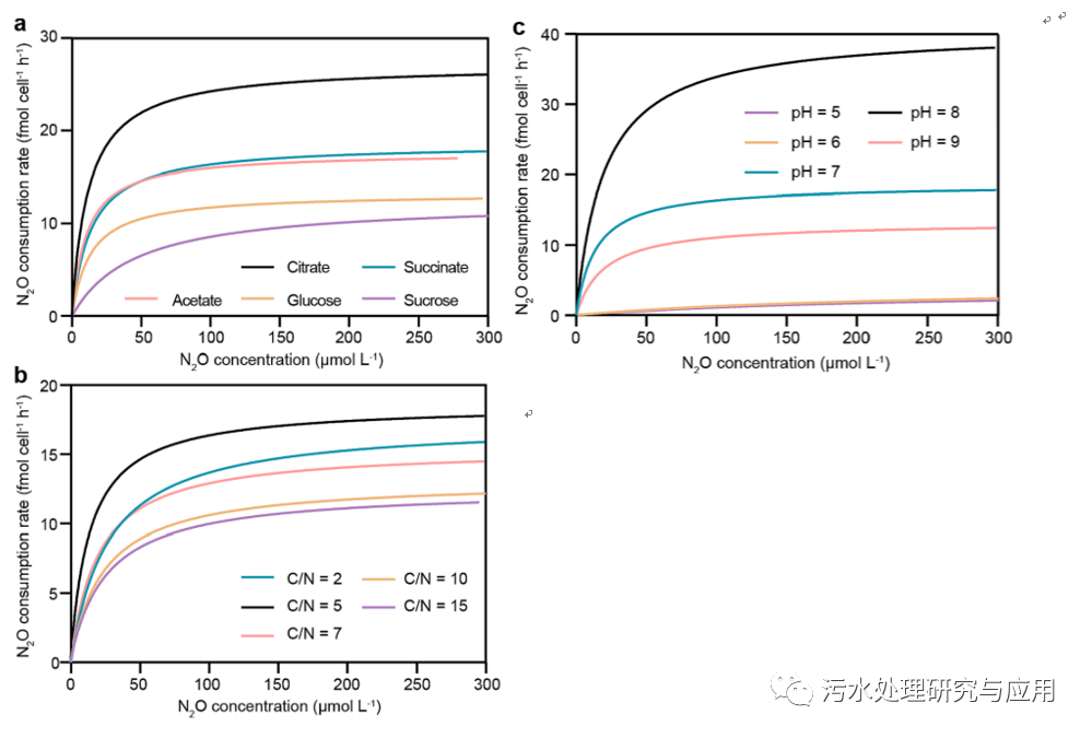 圖1、采用Michaelis-Menten模型分析了(a)碳源、(b)C/N和(C)pH對N2O去除動力學的影響。