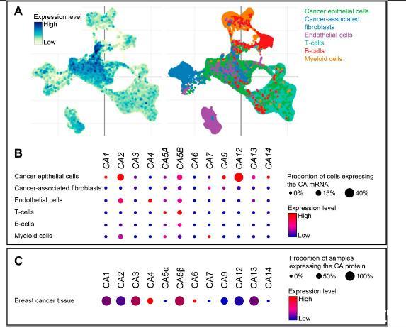 圖1、在人類乳腺癌組織中,線粒體CA5A和CA5B在細胞類型中普遍表達,而非線粒體碳酸酐酶亞型在癌癥上皮細胞和內皮細胞中占主導地位,除了CA7僅由癌癥相關的成纖維細胞和骨髓細胞表達。A)總體碳酸酐酶表達強度顯示為t-SNE圖(左)和相應的成簇細胞類型(右)。B)圖顯示了人乳腺癌中碳酸酐酶表達的細胞類型特異性模式。報告的單細胞測序數據涵蓋24489個癌上皮細胞、6573個癌相關成纖維細胞、7605個內皮細胞、35214個T細胞、3206個B細胞和9675個髓樣細胞。數據是從Broad Institute托管的在線單細胞門戶中提取的。C圖顯示了294個乳腺癌樣本中碳酸酐酶的蛋白質表達水平。