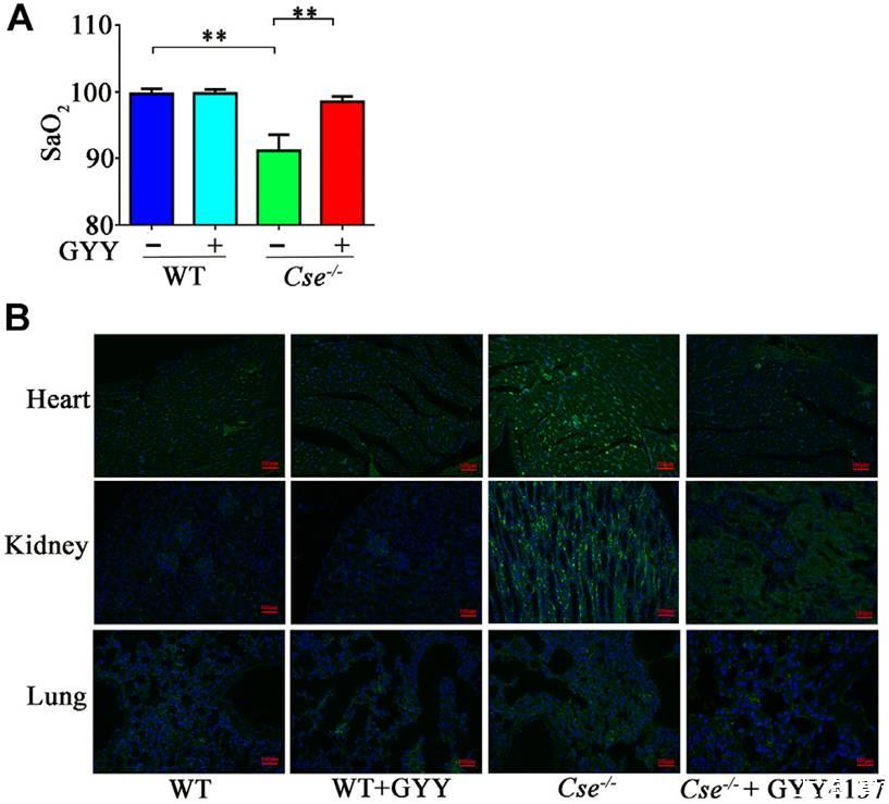 圖1、降低的H2S水平有助于降低Cse-/-小鼠的SaO2和組織缺氧。WT和Cse-/-小鼠用鹽水或GYY4137(50mg/kg)給藥。注射后二十四小時,將小鼠麻醉并測量SaO2水平。(A),血氧飽和2水平在WT和Cse的-/-小鼠用鹽水或GYY4137治療。(B),WT和Cse-/-小鼠心臟、肺和腎臟中Hypoxyprobe信號的代表性圖像,使用鹽水或GYY4137給藥。