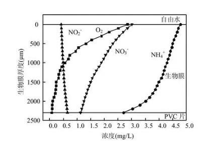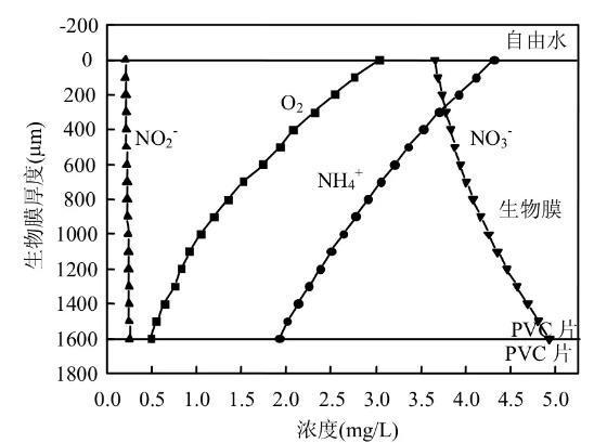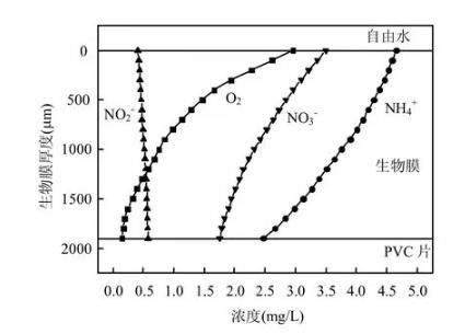 2.2.3 2.0Pa剪切力生物膜內(nèi)物質(zhì)濃度分布當(dāng)磁力攪拌器轉(zhuǎn)速為600r/min,即模擬2.0Pa沖刷剪切力時(shí),生物膜培養(yǎng)45d達(dá)到成熟,其厚度為(1.6±0.1)mm.這時(shí)從反應(yīng)器中取出生物膜,分別用DO、、、微電極測(cè)定生物膜內(nèi)各種物質(zhì)濃度的分布情況.測(cè)定結(jié)果如圖6所示。
