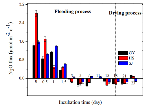 通過完整的沉積物芯樣培養和瓶校準靜態頂空氣相方法,研究了三峽大壩WLFZs的典型洪水-干燥過程中N2O的產生和排放。結果顯示在洪水階段的前1.5天存在N2O源-匯轉換。盡管與其他內陸水體相比,N2O的排放通量相對較小,但由于整個三峽大壩區域WLFZs的極大規模,總量應予以考慮。洪水初期的N2O突發排放也應在未來的水庫操作中加以考慮,以發揮其減緩潛力。