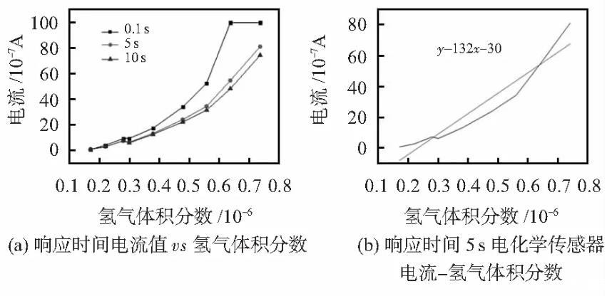2)傳感器對(0.1~0.8)×10-6體積分數的富氫水具有良好的傳感性能,電化學傳感器電流與氫氣體積分數呈正比例線性關系,其響應時間低于5 s。