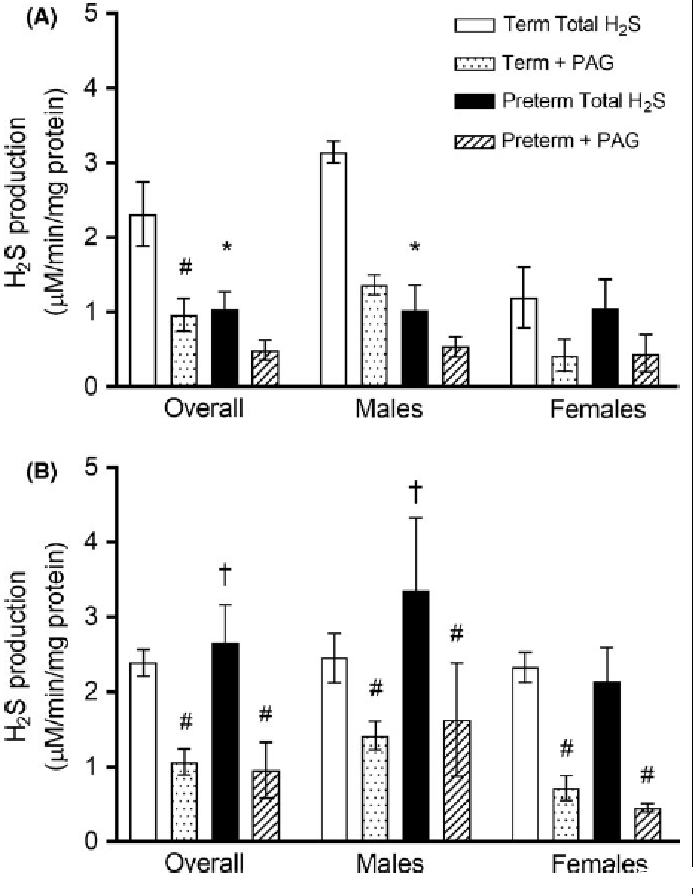 圖4、收集自胎兒(圖A;足月雄性,n=4;足月雌性,n=3;早產(chǎn)雄性,n=4;早產(chǎn)雌性,n=4)和產(chǎn)后24小時的新生兒(圖B;足月雄性,n=4;足月雌性,n=3;早產(chǎn)雄性,n=3;早產(chǎn)雌性,n=4)的心臟能夠產(chǎn)生硫化氫,當提供過量的底物和輔因子時。添加丙炔氨酸(PAG)表明,在產(chǎn)后心臟中,總硫化氫的一個顯著比例是通過依賴CSE的機制產(chǎn)生的。*P<0.05與同一性別的相應足月組比較,?P<0.05與胎兒時間點內的相應胎齡組比較,#P=0.05與相應的總硫化氫產(chǎn)生值比較。