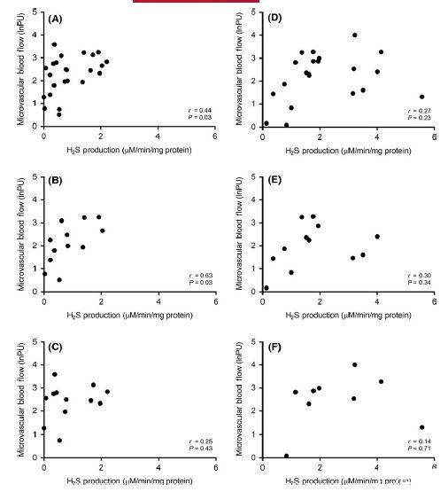 圖3、在產(chǎn)后10小時(A-C)和24小時(D-F)微血管血流與總血管硫化氫產(chǎn)生能力的關聯(lián)。在所有新生兒(圖A;n=24)、足月新生兒(圖B;n=12)中觀察到正相關,但在早產(chǎn)新生兒(圖C;n=12)中未觀察到。在產(chǎn)后24小時,無論是總體(圖D,n=22)還是足月(圖E;n=12)或早產(chǎn)(圖F;n=10)新生兒,微血管血流與總血管硫化氫產(chǎn)生能力之間均未觀察到關聯(lián)。