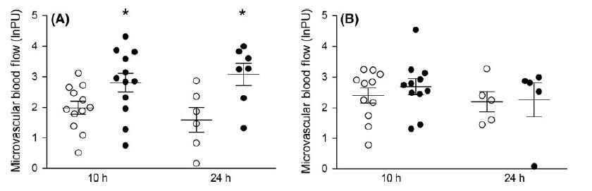 圖1、(A)雄性和(B)雌性豚鼠新生兒的微血管血流。使用激光多普勒流量測量在頸部的皮下微血管血流,以自然對數(shù)單位表示(lnPU),在產(chǎn)后10小時和24小時對足月(開放圓圈)和早產(chǎn)(實心圓圈)豚鼠新生兒進行測量。24小時組的動物在產(chǎn)后10小時和24小時都進行了微血管評估。A,與足月雄性相比,早產(chǎn)雄性在產(chǎn)后10小時(足月,n=12;早產(chǎn),n=12)和24小時(足月,n=6;早產(chǎn),n=7)的微血管血流顯著更高。B,胎齡對雌性在產(chǎn)后10小時(足月,n=11;早產(chǎn),n=11)或24小時(足月,n=5;早產(chǎn),n=5)的微血管血流沒有影響。*P<0.05與同一性別的相應足月組比較。