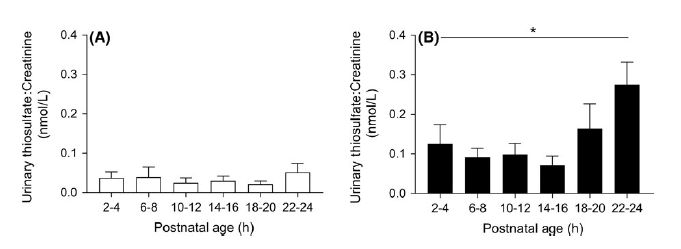 圖5、在產(chǎn)后24小時內,通過測量尿中的硫代硫酸鹽來評估足月(圖A;n=11)和早產(chǎn)(圖B;n=12)豚鼠的系統(tǒng)總硫化氫產(chǎn)生。在整個24小時期間,尿中的硫代硫酸鹽在早產(chǎn)兒中顯著高于足月兒(P=0.002)。在早產(chǎn)組中,隨著產(chǎn)后年齡的增長,系統(tǒng)總硫化氫產(chǎn)生增加(*P=0.003),在足月兒中未觀察到這種關系。