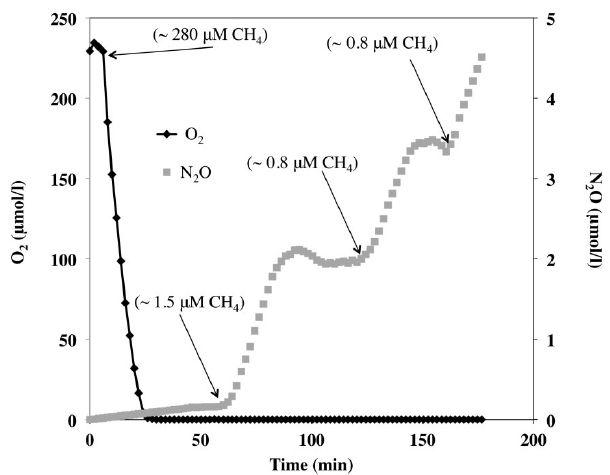 圖2、孔隙水化學隨MAT的變化。孔隙水在MAT周圍0至2 cm處取樣。MAT設置在~8 cm土壤深度,密度和空氣壓力分別為0.2 m2管外表面/m2土壤和25 kPa。Eh是相對于Ag/AgCl參比電極。