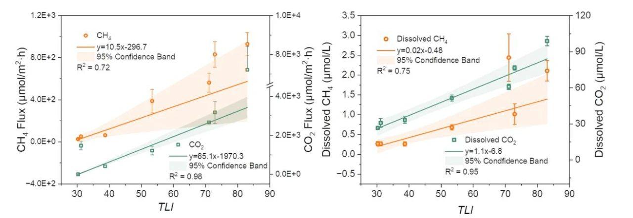 圖2長江中下游流域湖泊群富營養化指數與(a)CH4和CO2釋放通量之間的相關性;(b)與溶存態CH4和CO2之間的相關性。