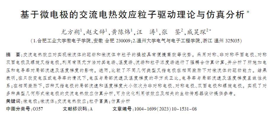 由于交流動電效應具有激勵電壓低、易于誘導等優點,其對微流體操縱的應用在近二十年引起了廣泛關注,交流動電效應主要包括介電泳(DEP)、交流電滲(ACEO)和交流電熱(ACET)效應,較低的激勵電壓和不依賴外部裝置的微流體直接誘導方式對實現集成化、低功耗和低成本的生物傳感器具有較高的應用價值。例如:Zhang等運用DEP效應,并通過微電極芯片對冷鏈食品中的SARS-CoV-2刺突蛋白進行實時、選擇性、低成本的檢測,張磊等通過在微通道壁面布置微電極陣列產生交變電場,提出了利用交流電滲(ACEO)增強流體混合的方法,Selmi等將ACET應用于微流體通道中蛋白質的檢測,說明ACET可以在微流體通道內誘發渦流場,適用于混合和泵注應用。