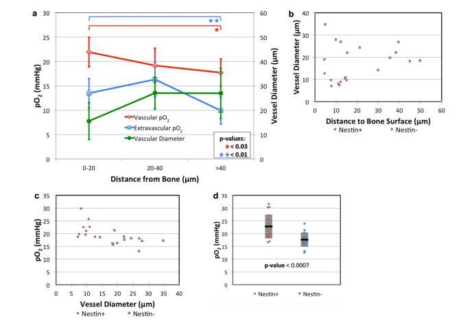 (a)血管平均直徑(綠線,4只小鼠的38根血管)、血管內(nèi)(紅線,4只小鼠的38根血管)和血管外(藍(lán)線,3只小鼠的39個位置)pO2與骨表面到測量位置的距離呈函數(shù)關(guān)系。誤差為±標(biāo)準(zhǔn)偏差。(b)nestin+血管(紅色圓圈,n=9根血管,來自3只小鼠)和nestin-血管(藍(lán)色正方形,n=12根血管,來自3只小鼠)的直徑與骨內(nèi)膜表面距離的函數(shù)關(guān)系圖。(c)同樣的nestin+血管和nestin-血管的pO2與血管直徑的函數(shù)關(guān)系圖。(d)nestin+(紅色圓圈,n=17根血管,來自7只小鼠)和nestin-(藍(lán)色方框,n=16根血管,來自5只小鼠)血管的pO2。顯示每組數(shù)據(jù)的平均值(黑線)和±標(biāo)準(zhǔn)偏差(陰影框)。