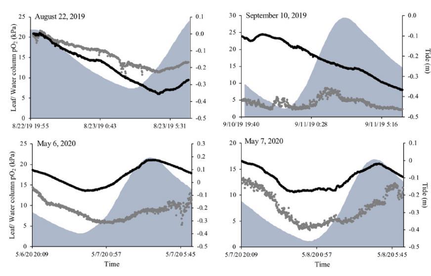 圖5、夜間葉片與水柱pO?受潮汐影響。夜間(日落至日出)葉片(灰線)與水柱(黑線)pO?以及潮位(陰影灰)漲潮時水柱O?升高,葉片內(nèi)O?同步增加5–8 kPa,形成潮補氧效應(yīng)。