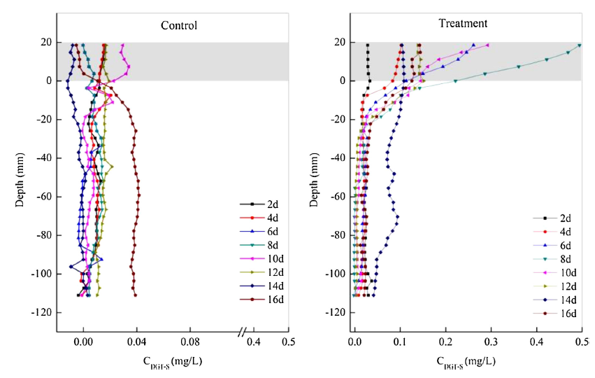 圖5、沉積物剖面中可溶性S的變化。ZrO-AgI DGT測量的硫化物分布顯示,處理組(右)S濃度在培養(yǎng)第8天達到峰值(比對照組高一個數(shù)量級),且高濃度區(qū)集中在SWI附近。對照組(左)S濃度整體較低且分布均勻。這種差異直接證明藻類分解是硫化物的重要來源,其釋放的硫主要分布在界面附近而非深層沉積物中。