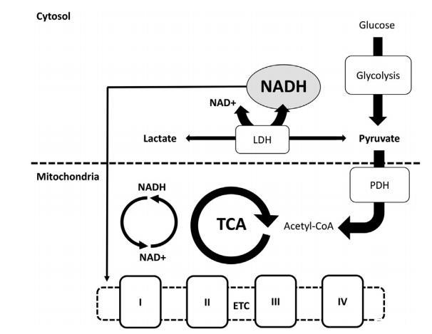 本研究的主要發(fā)現(xiàn)是,在高血糖條件下,NRK-52E細(xì)胞經(jīng)草氨酸處理后,新陳代謝完全改道。這似乎導(dǎo)致了基礎(chǔ)和最大呼吸能力的提高以及乳酸生成的減少。乳酸鹽的產(chǎn)生與氧化還原平衡密切相關(guān),即與細(xì)胞膜NAD+/NADH平衡密切相關(guān)。有趣的是,乳酸鹽生成量的主要變化受高血糖條件的影響,而氧化還原平衡(NAD+/NADH比率)、細(xì)胞活力和增殖則受草酸鹽處理的影響。這表明乳酸脫氫酶LDH抑制確實會導(dǎo)致NAD+/NADH比率發(fā)生巨大變化,進(jìn)而引導(dǎo)NRK-52E細(xì)胞增加氧化磷酸化(圖5)。這些發(fā)現(xiàn)與高度糖酵解細(xì)胞的報告一致,在高度糖酵解細(xì)胞中,草氨酸已被證明能將糖酵解通量轉(zhuǎn)向氧化磷酸化,即把沃伯格代謝表型(即使在有足夠氧氣維持氧化磷酸化的情況下,乳酸鹽的產(chǎn)生也會增加)轉(zhuǎn)變?yōu)榘退沟麓x表型。