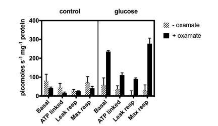 圖3:經(jīng)100mM草氨酸處理或未經(jīng)100mM草氨酸處理的對照細(xì)胞和高血糖細(xì)胞培養(yǎng)物的呼吸參數(shù)。對基礎(chǔ)呼吸、ATP鏈接呼吸、泄漏呼吸和最大呼吸進(jìn)行了測定。單用高血糖條件和草氨酸處理對所有測量參數(shù)的影響都是遞減的,而在高血糖條件下用草氨酸處理細(xì)胞可顯著增加所有呼吸參數(shù)(p<0.0001)。