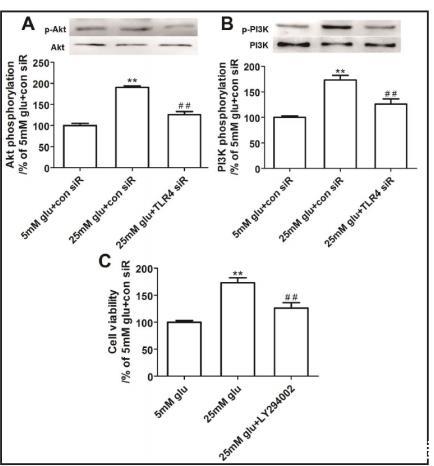 我們接著研究了TLR4對系膜細胞中PI3K-Akt通路的影響。蛋白質印跡分析顯示,高血糖顯著增強了PI3K和Akt的磷酸化,在TLR4敲低后恢復到正常水平,盡管PI3K和Akt的總表達保持不變(圖3A和B)。如圖3C所示,通過LY294002抑制PI3K也顯著減輕了高葡萄糖誘導的細胞增殖。