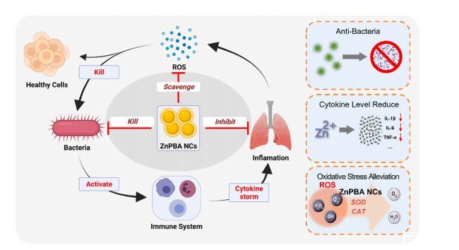 細菌性肺炎已被證實會導致急性和嚴重的病理性肺損傷,以及無法控制的氧化細胞因子風暴。針對細菌性肺炎的有效療法要求高效清除病原體、緩解氧化應激和抗炎。然而,目前的療法無法通過一種性能令人滿意的單一藥物來實現(xiàn)這些目標。在此,我們報告了一種自組裝的普魯士藍類似物六氰基鐵酸鋅納米催化劑(ZnPBA NCs),它具有出色的廣譜抗菌活性,并對多種活性氧(ROS)和相關(guān)的細胞因子風暴具有抗氧化催化活性。通過使用各種氧化物質(zhì)和體內(nèi)小鼠細菌性肺炎模型,我們驗證了合成的六氰合鐵酸鋅納米催化劑可以同時消除細菌感染,并在很大程度上緩解感染引起的氧化應激和炎癥,這表明它在防治多種細菌感染相關(guān)疾病方面具有廣闊的臨床應用前景。