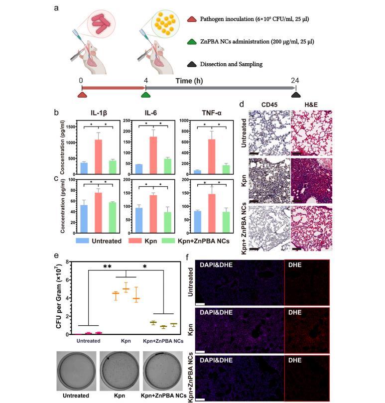 為了評估肺損傷和免疫浸潤的程度,對病理切片和免疫組化(IHC)切片進行了H&E染色和CD45抗體標記。從圖6d中的H&E染色和CD45+IHC切片可以看出,Kpn組肺部組織間隙有大量血細胞浸潤,肺泡充盈,這是病理征象。此外,在Kpn組的肺組織中發現了大部分CD45+信號,說明中性粒細胞廣泛浸潤。這些病理現象表明肺炎克氏菌誘發的肺組織損傷嚴重,即急性細菌性肺炎。相反,根據ZnPBA NCs治療組小鼠的組織病理學圖像,肺損傷大大減輕,H&E染色切片中的血細胞浸潤大大減少,IHC切片中的CD45+中性粒細胞幾乎可以忽略不計。