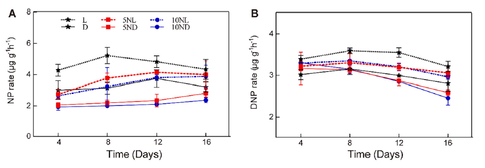 圖2、不同處理中DCD的分布變化。對(duì)比了光照與黑暗條件下DCD的殘留量。光照處理中DCD的降解速率更快,且高劑量DCD(10%)的殘留量更高。附生生物膜的存在(光照下)顯著加速了DCD的分解,可能與微生物活性增強(qiáng)有關(guān)。