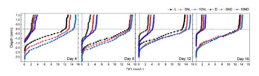 圖1、土壤-水界面溶解氧(DO)濃度的變化。展示了不同處理下土壤-水界面溶解氧(DO)濃度的動(dòng)態(tài)變化。光照條件下的DO濃度顯著高于黑暗條件(p<0.05),且DCD的添加進(jìn)一步提高了DO水平。這表明附生生物膜的光合作用(光照下)和DCD的化學(xué)作用共同增強(qiáng)了氧氣的產(chǎn)生與滲透。