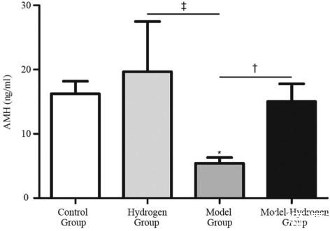 圖1、富氫水對血清抗苗勒管激素(AMH)濃度的影響。數(shù)據(jù)以均值±標準誤表示。與對照組相比*P<0.05;?P<0.05;?P<0.01。