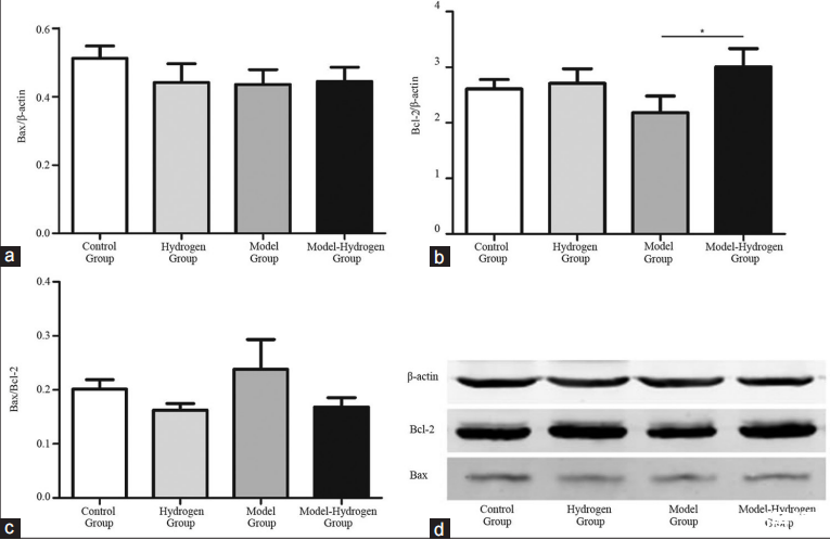 圖5、通過蛋白質(zhì)印跡分析確定的Bax和Bcl-2表達。數(shù)據(jù)以均值±標準誤表示。(a)如圖d所示的Bax水平。(b)如圖d所示的Bcl-2水平。*P<0.05。(c)Bax/Bcl-2比值。(d)免疫印跡圖。Bcl-2:B細胞白血病/淋巴瘤2;Bax:BCL2相關(guān)X蛋白。