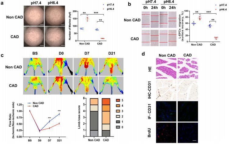 為了確定不同患者EPC的體外血管生成能力,采用了Matrigel實驗。與在pH值為7.4的環境中相比,非CAD組的EPCs在酸刺激下的血管生成明顯增強,而CAD組的EPCs在相同處理下的結果則相反(圖2a)。傷口愈合的結果也類似(圖2b)。為了進一步探討這些結果的穩健性,我們將非CAD組和CAD組的EPCs全身注射到后肢缺血的裸鼠體內,結果顯示,與注射CAD組EPCs的裸鼠相比,注射非CAD組EPCs的裸鼠血流恢復更快(圖2c)。后肢的免疫組化結果見圖2d。