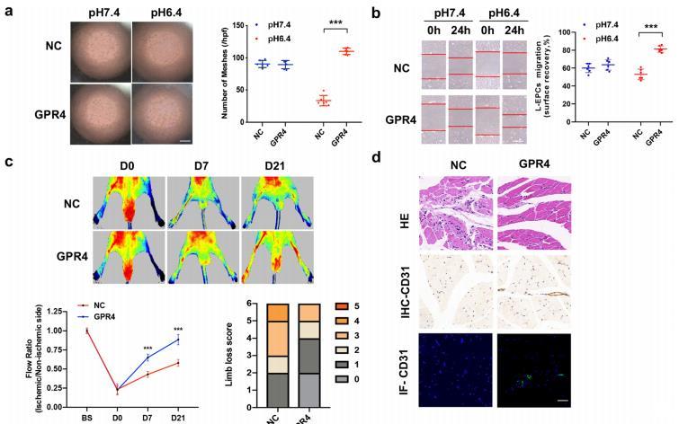 圖4:GPR4基因轉移可恢復CAD患者EPCs酸性介導的血管生成。a,b EPCs在不同pH環境中培養6h后,管形成(a比例尺=40μm)和遷移(b比例尺=20μm)的代表性照片和定量分析。c注射EPCs后裸鼠后肢缺血血流的代表性照片和定量分析。d缺血后肢的HE、IHC-CD31和IF-CD31染色切片。
