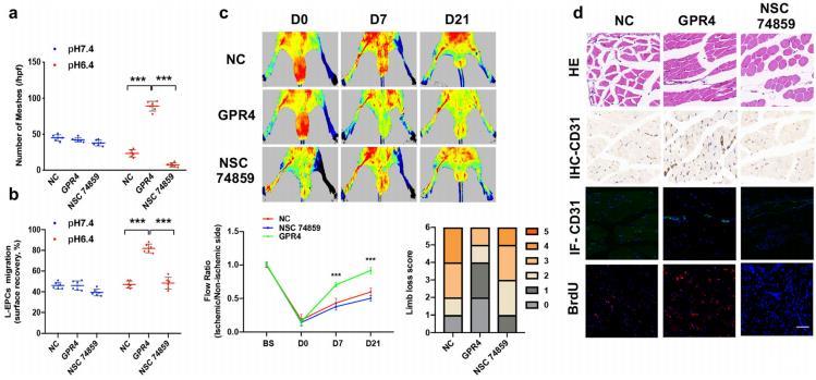 圖6:GPR4在酸性微環境的刺激下通過STAT3信號通路調節來自CAD患者的EPCs中VEGFA的表達。a,b在不同pH環境的EGM培養基中培養6h后定量分析管形成(a)和遷移(b)。c注射轉染了陰性對照質粒(NC)或表達GPR4和NSC74859的質粒的EPC后,裸鼠后肢缺血血流的代表性照片和定量分析。d缺血后肢的HE、IHC-CD31、IF-CD31和BrdU染色切片。