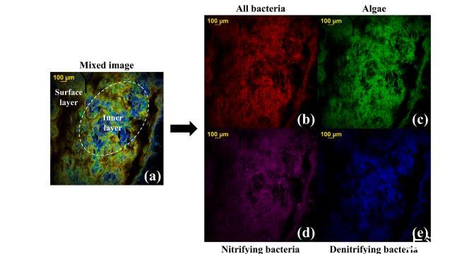 圖6 PBR-1中ABA的FISH圖像:組合圖像(a)、大部分細菌(b)、藻類(c)、反硝化細菌(d)和硝化細菌(e)。