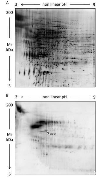 為了證實呼吸電子鏈復合物在外泌體表面表達,我們使用EZ-linksulfo-NHS-LC-LC生物素酯對膜表面蛋白進行化學共軛,并對呼吸電子鏈復合物中的一個蛋白即ATP合成酶β亞基(ATP5B)進行了免疫檢測。EZlinksulfo-NHS-LC-LC生物素酯是一種細胞滲透性氨基反應劑,廣泛用于標記暴露在活細胞表面的蛋白質。此外,生物素與中性印跡蛋白的結合是已知最強的非共價相互作用之一,是使用HRP結合物中性印跡蛋白特異性檢測生物素化蛋白質的有力工具。因此,只有那些暴露在表面并被生物素標記的蛋白質才會被揭示出來。在這里,生物素化的外泌體被裂解并通過二維凝膠電泳(2-DE)分離。將等量的裂解液轉移到硝酸纖維素膜上,用HRP連接的中性葡萄蛋白檢測,并與銀染色的相同裂解液進行比較。通過比較總蛋白圖譜(圖7A)和生物素化蛋白圖譜(圖7B),可以發現蛋白質的數量和組成存在很大差異。這一結果與外泌體表面蛋白生物素化的高度特異性是一致的。