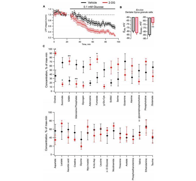 對2-DG處理過的大鼠腦樣本進行核磁共振分析后發現,它們的腦能量儲備(糖原和腺苷酸減少,腺苷增加)和線粒體代謝(琥珀酸減少)發生了顯著的有害變化(圖3C)。