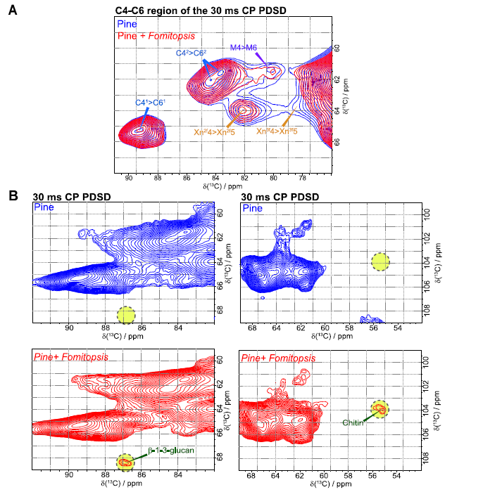 圖3、富松木在缺氧條件下腐爛的固體核磁共振13c。a)76–91和58–68 ppm區(qū)域的30 ms CP-PDSD13C NMR譜的疊加,顯示了xylan Xn4-Xn5和mannan M4-M6的交叉峰。b)左側(cè)為82–92和58–70 ppm區(qū)域的30 ms CP-PDSD13C NMR譜,右側(cè)為52–70和98–110 ppm區(qū)域。