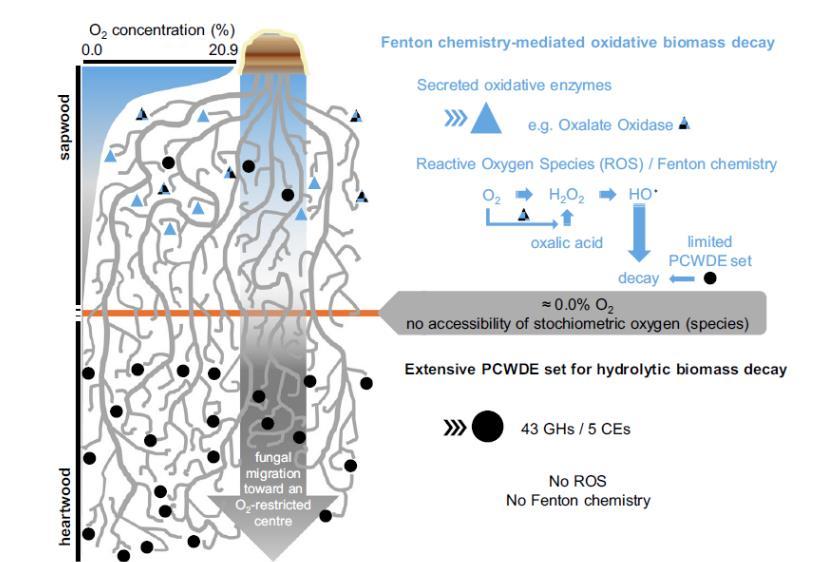 圖5、圖解模型說(shuō)明了在缺氧條件下,平孔擬南芥在木材中的滲透。展示了褐腐真菌如何在缺氧條件下穿透木材。研究數(shù)據(jù)表明,從有氧條件下的芬頓化學(xué)介導(dǎo)的木材降解轉(zhuǎn)變?yōu)槿毖鯒l件下的PCWDE(植物細(xì)胞壁降解酶)驅(qū)動(dòng)的水解分解。與褐腐真菌的分階段降解機(jī)制一致。