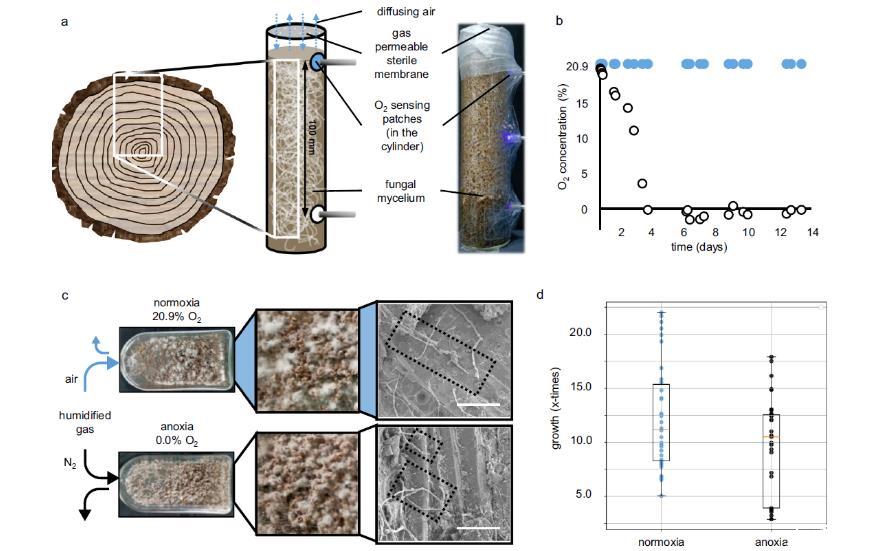 圖2、對(duì)不同木材深度處的真菌及其酶的代謝組學(xué)鑒定。a)模擬真菌在從樹(shù)干表面到內(nèi)部(從有氧到缺氧)的整個(gè)徑向梯度的固態(tài)培養(yǎng)設(shè)置,允許非侵入式測(cè)量頂部(藍(lán)色貼片)和底部(白色貼片)的O?濃度。b)在頂部(藍(lán)色)和柱底(白色)測(cè)量的O?濃度,分別代表空氣-木材界面和柱底的O?濃度。c)在有氧和缺氧條件下,松木上的Fomitopsis pinicola的固態(tài)培養(yǎng)。