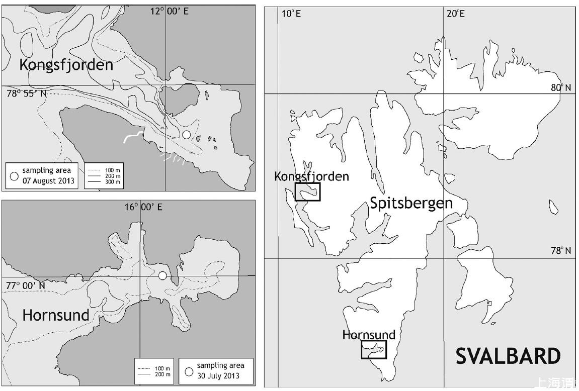 圖1、斯瓦爾巴群島受調查峽灣的位置(右側面板)以及康斯峽灣(左上側面板)和霍恩松德(左下側面板)的采樣區域。