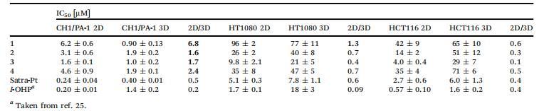 研究癌癥細胞系的抗增殖活性是探索實驗化合物抗癌潛力的關鍵第一步。因此,我們使用對鉑(II)類藥物敏感性不同的細胞系,包括CH1/PA-1卵巢畸胎癌(最敏感)、HCT116結腸癌(中度敏感)和HT1080纖維肉瘤(不敏感)細胞,在不同的缺氧和非缺氧細胞培養模型中研究了化合物1-4和沙鉑的細胞毒性,并將它們與奧沙利鉑(l-OHP)(之前發表的數據)進行了比較。第一步,通過阿拉瑪藍檢測法確定缺氧球形細胞和非缺氧單層培養細胞的IC50值。在非缺氧單層培養物中,所有復合物對敏感細胞株CH1/PA-1的活性最高,IC50值大多在低微摩爾范圍內,而對耐藥細胞株HT1080的活性最低。一般來說,復合物在所有三種細胞系中的活性按以下順序增加:1<4<2<3<沙鉑<l-OHP,表明參考化合物沙鉑和奧沙利鉑在單層培養中的細胞毒性最強。研究化合物1-3的順序與這些物質的親脂性非常吻合,1的親脂性最小,3的親脂性最大。這些數據與之前公布的結果非常吻合。在CH1/PA-1細胞系中的數值與參考文獻38中公布的數值略有不同,這可能是由于使用了一種名為"CH1/PA-1"的藥物。38中的數值略有不同,這可能是由于使用了不同的試劑對有活力的細胞進行染色(MTT與阿拉瑪藍)。